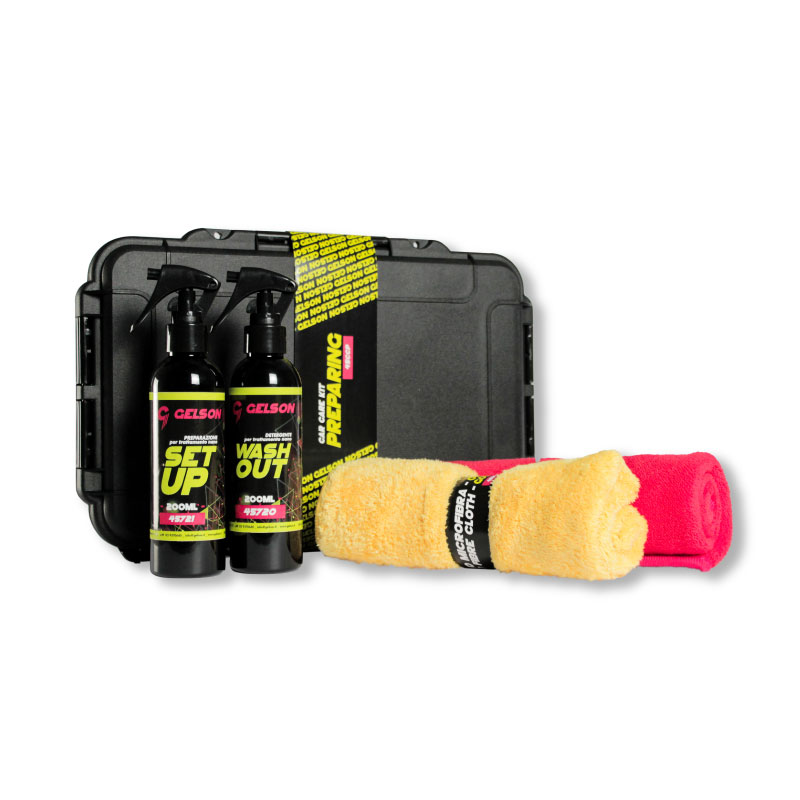 Kit for cleaning and surface preparation before treatment with nanoceramic coatings.